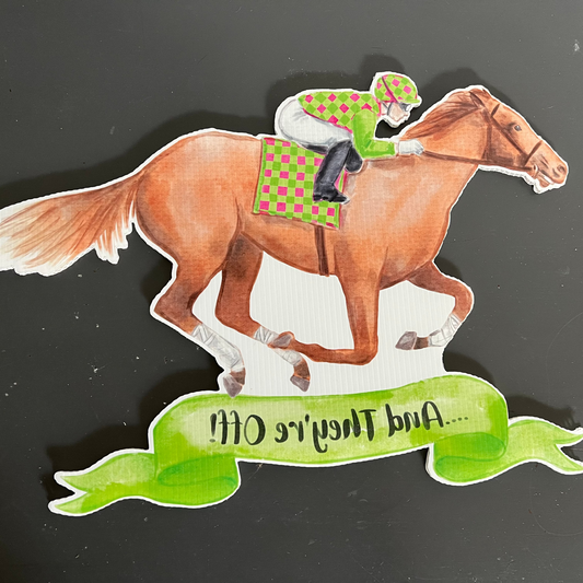 Mirrored Green “And they’re off” Garden Stake (Warehouse Sale)