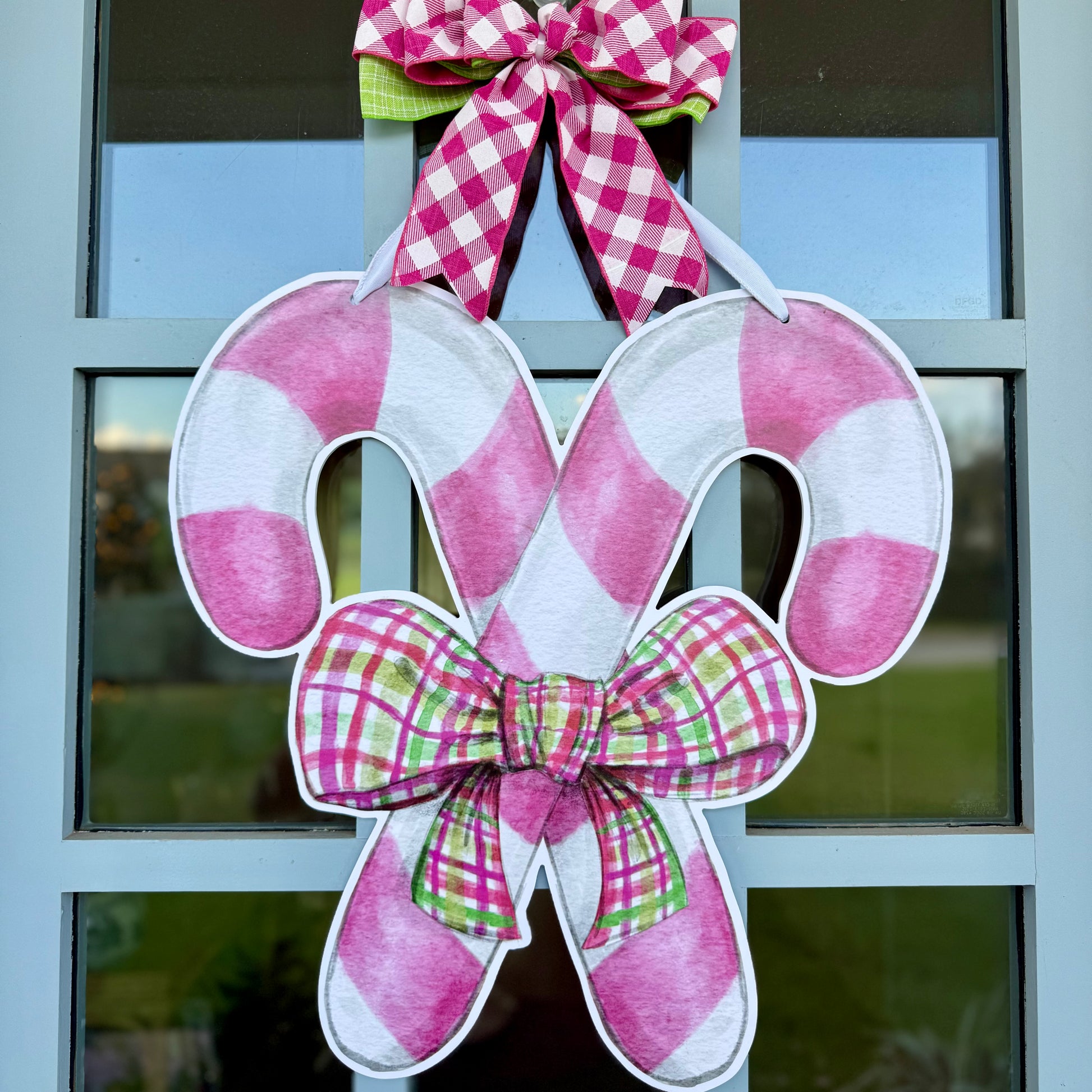 Our Candy Cane Duet double-sided door hanger is the sweetest way to deck your porch for the holidays. Featuring classic red on one side and a modern pink twist on the other, this versatile design lets you switch up your holiday style with ease.
