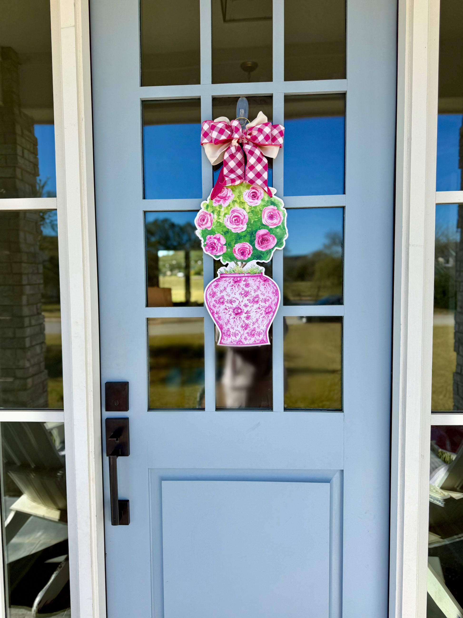 Planted in a pink chinoiserie planter, the Rosy Topiary door hanger as a soft nod to Valentine's that can last all spring long!